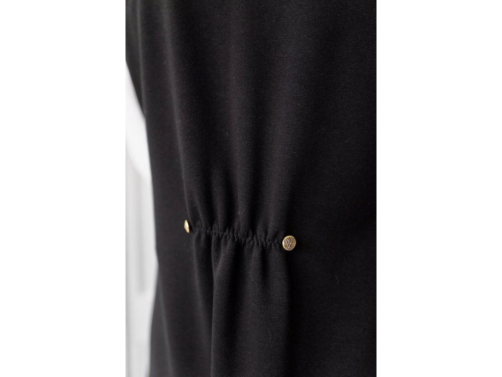 Detaily: Velký límec, praktické kapsy, jemné řasení vzadu a zajímavé zlaté knoflíky na krajích.