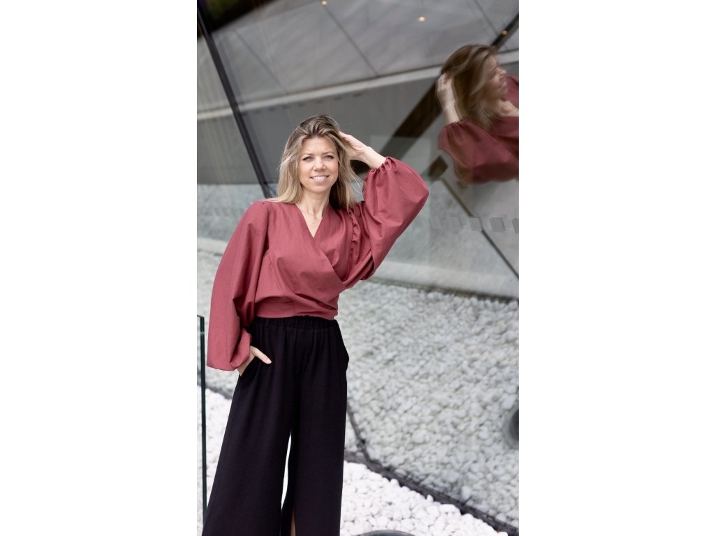 Tato halenka je navržena s důrazem na detaily – bohatě řasené rukávy ve stylu balónového objemu vytvářejí jemně dramatický efekt, zatímco střídmá silueta těla zůstává vzdušná a lichotivá. Rukávy krásně drží tvar, ale nepůsobí těžce, díky vyvážené kombinaci lnu, bavlny, viskózy a elastanu.