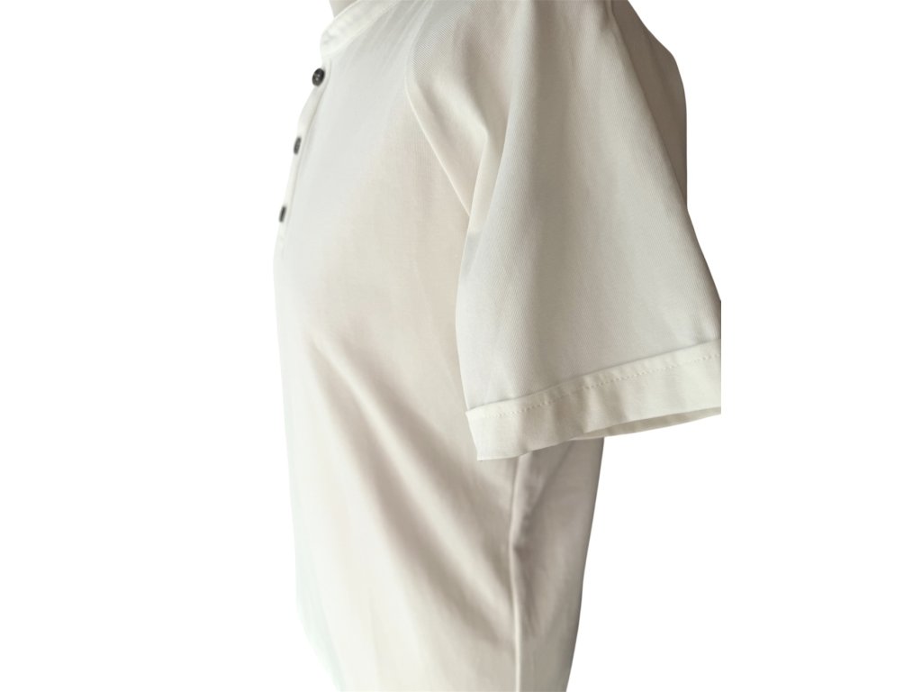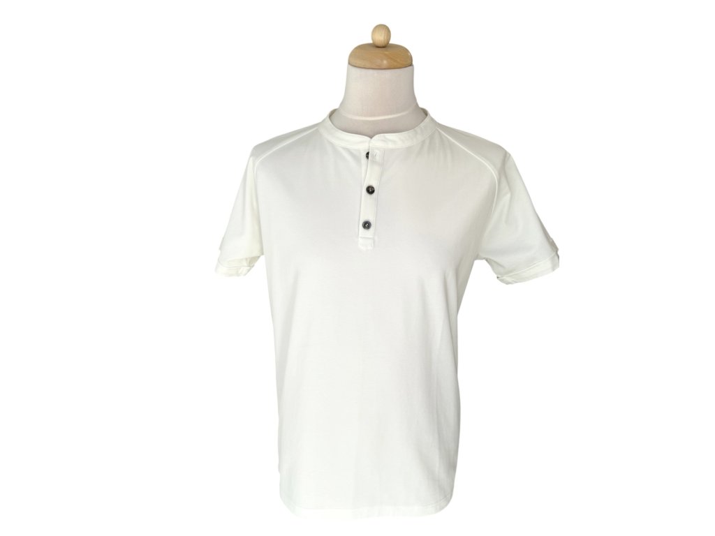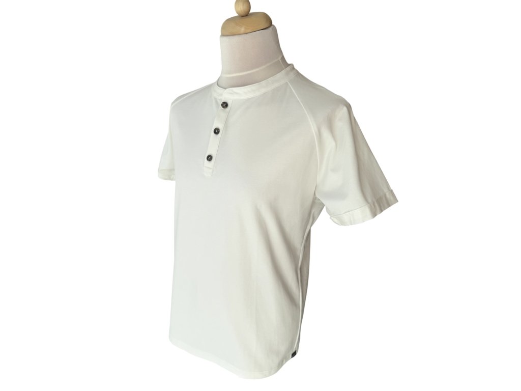 Výrazné kontrastní knoflíčky v přední části a dvoucentimetrový stojáček jsou detaily, které tento kousek odlišují od běžných triček. Střih, který není ani příliš přiléhavý, ani příliš volný, lichotí každé postavě.